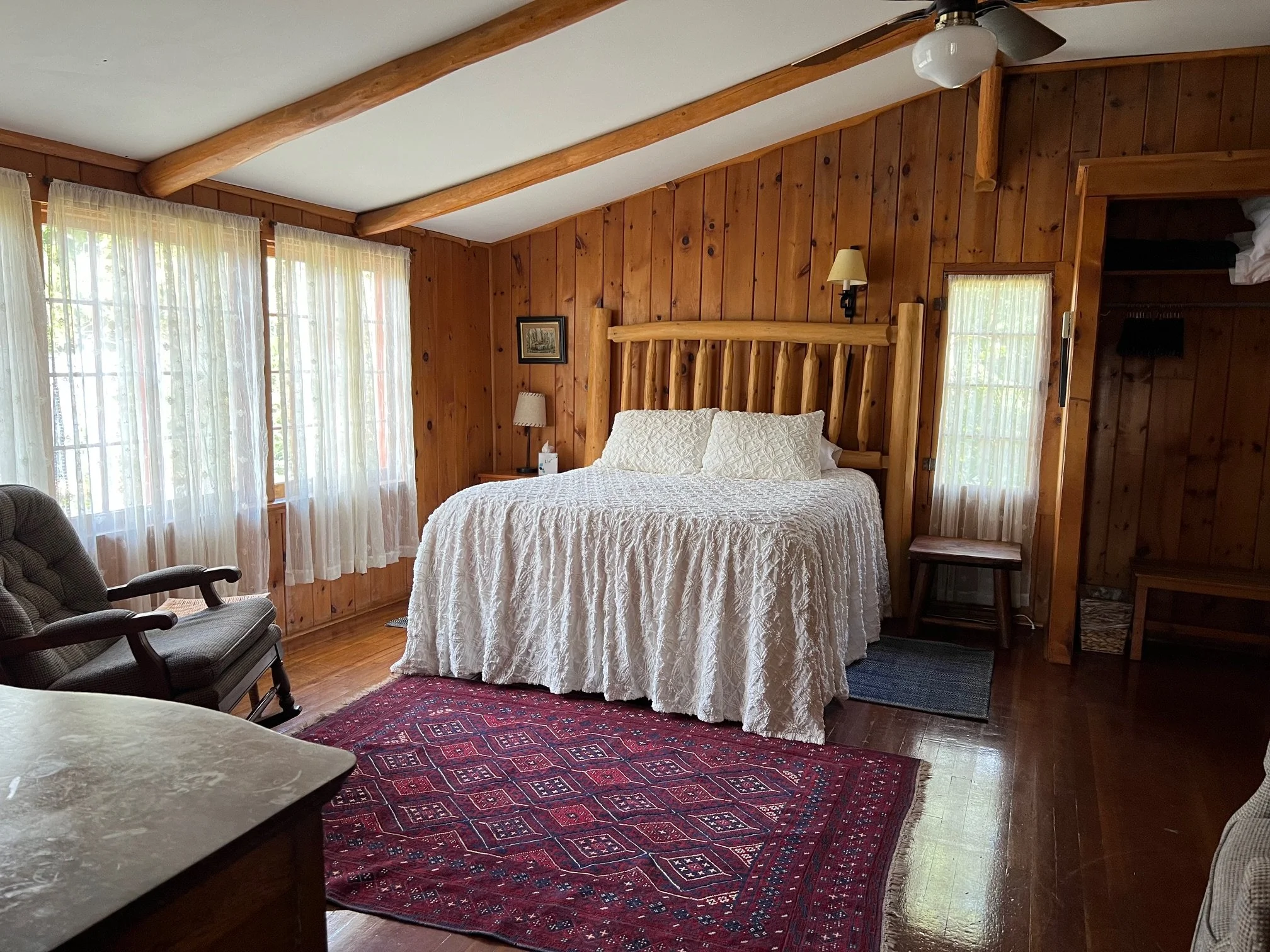 The first room is the largest and offers a queen size bed with a sitting area; a stove provides the ambiance of a fireplace but is thermostatically controlled. Oscillating fans are provided for warmer days. The second bedroom is smaller and has a double bed. The bathroom can be accessed from either of these rooms and has a tub and shower.