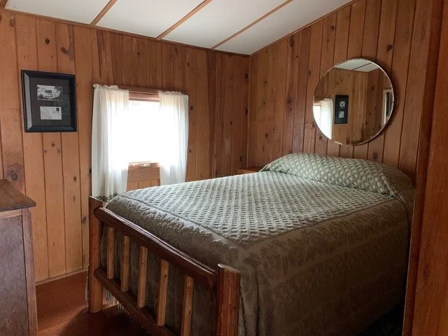 This is a two-bedroom log cabin that was constructed in the 1920's and is located on a small bluff above the swimming beach and sauna. A somewhat steep path with a railing leads up to the cabin which offers privacy and pretty views of the lake, only 105' away. The interior is of knotty pine with hardwood floors.